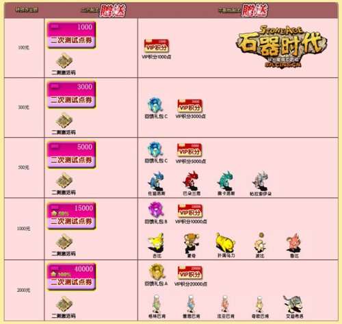 点击了解活动详情点击进入 活动时间:11月17日—11月30日 活动期间,凡对《石器时代》进行预充值的玩家,不但将可以在删档二测服中获得相应的商城点卷,并且,在即将开放的《石器时代》不删档测试服中还能再次获得同等的商城点卷。除此之外,还将获得由官方免费赠送的额外超值好礼,纪念宠物、VIP积分以及回馈礼包……众多好礼只需一次预充即可统统抱回家! 活动奖励