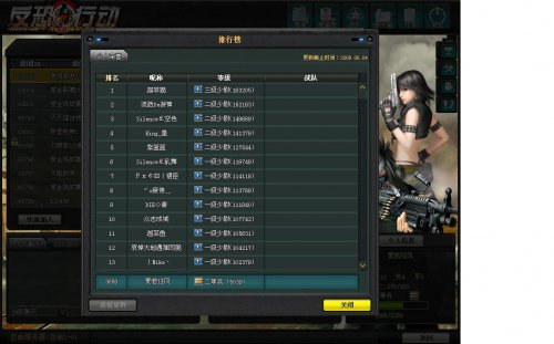 罗马不是一日建起,高手不是一日炼成。想成为 《反恐行动》中独孤求败的高手前,会经历有无数的坎坷,不过,你只要能坚持过来。你现在遭受的那些挫折,将在你的成功后,变为传奇! 《反恐行动》个人排行榜将见证你这条渐渐成长的道路。想知道自己在《反恐行动》中自己的爆头率有多高?想知道自己能在玩家中排名第几?渴望结识高手学习经验? 《反恐行动》个人排行榜一一满足你! 在游戏大厅的右上角竖排第一个“金杯”图标就是功能巨大的排行榜!通过排行榜我们能看到个人等级排名前100位玩家的ID和等级。名次从1到100为顺序,最优秀的玩家排在最显眼的位置!右边的滚动条可以控制看到更多的玩家信息。如果你想结交上榜好友,只需要点击该玩家ID,通过下方的“加为好友”来满足你的心愿。 排行榜最下方一排就是你的排名,也同样可以查看自己的战绩,通过各种技术分析,可以将自己擅长的某一方面培养,比如爱玩枪的就努力提高自己的爆头率,这样在不知不觉中,自己的等级和排名也随之提高! 《反恐行动》个人排行榜将忠实记录你每一场战斗的胜利,见证你从小兵到少尉到将军的艰辛历程。几百乃至成千上万次战斗的考验,将磨砺你的技术、斗志、勇气与信念!现在,就让我们为了排行榜“榜首”的荣耀而奋力厮杀吧! |