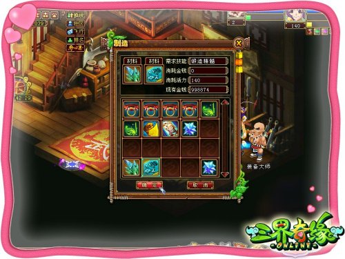 玩三界,寻奇缘。搜狐畅游旗下冰动娱乐推出的首款实现“全屏秒杀”的2D回合制网游《三界奇缘》12月3日开启公测,本周开放客户端下载。在公测来临之际,让我们率先了解下《三界奇缘》其独特的合成工艺。 在《三界奇缘》中,合成工艺多种多样,装备打造、装备封印、装备强化、宝石镶嵌等特色系统将带给玩家逼真的生活体验,每个人都能充分享受“劳动”的乐趣。 装备打造,玩法多多 玩家们在《三界奇缘》中可以打造属于自己的装备,只要到“帮派技能大师”处学习相关装备打造技能就能打造。游戏中的装备打造系统完全还原现实中的打造形式,是一件体力活!打造一件装备必须消耗一份锻造配方和一个精铁,还会消耗一定的活力。不仅如此,玩家在打造装备过程中还能提高制作技能心得,提高自己的手艺。 三界奇缘装备打造系统