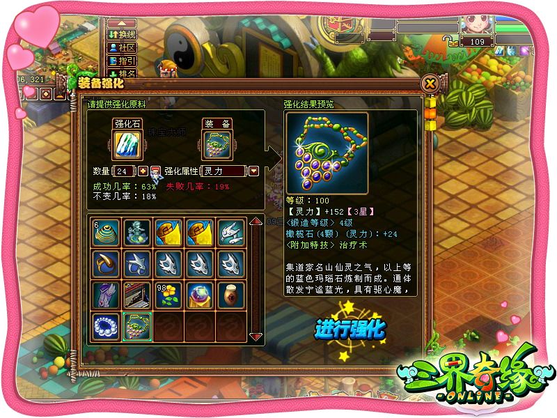 装备强化,至尊工艺 要想在《三界奇缘》中获得一件极品装备,那必须对装备进行强化。装备强化需要强化石作为媒介,它能帮助你提高强化成功率。装备强化后可以将一件装备的效果提升至一个极高的档次,无论是在各方面能力还是耐久等方面都将大大提高综合属性,穿戴强化后的装备让你练级、任务都不怕,PK更是胜人一筹。 三界奇缘装备强化系统