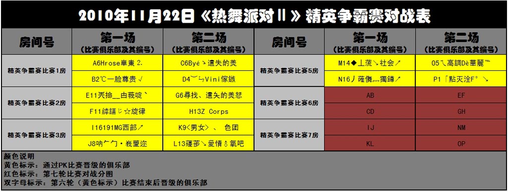 历时一个月的《热舞派对Ⅱ》首届大型跨服PK赛——“精英争霸赛”将于今晚进行首场冠军赛。今晚比赛结束后,将从入围的十六个俱乐部中决出前四名精英俱乐部,他们将手持入场券站到最终的总决赛舞台中央!尽管并非所有玩家都能站在舞台中参与斗舞征战,但是仍然有无数热心玩家在场外为他们支持的俱乐部不懈地投票。从本次比赛开始到现在,我们的参赛俱乐部们已经先先后后收到数十万的选票了。后续的比赛将更加激烈,相信也会有更多选票纷纷出现在每一个精英俱乐部的页面上!在这里,我们希望每一个参与到本次赛事的玩家都能从中得到欢乐,不管是投票的、拉票的还是上场PK的,也坚信本次比赛会成为你们在《热舞派对Ⅱ》中最难忘的经历! 2010年11月22日《热舞派对Ⅱ》精英争霸赛对战表 ■活动相关信息 -现场比赛输了的俱乐部也不用气馁,特设的投票复活机制可以让你在下一轮比赛中重新登上王者舞台,与全服高手同场竞技。获得投票数高的俱乐部可获得一次晋级的权利,在复活名额范围内,票数最高的俱乐部可以被复活;在比赛结束后,赢得投票总数前三名的俱乐部无论胜负,皆同样会有冠亚季军的梦想基金奖励 -每场三首歌决胜负,依次采取下列模式进行比赛:4K同步组队模式(bpm140-200);四键节拍组队模式(12级以上随机);4K同步组队模式(bpm140-200)。本比赛不记比分,只记胜负。 -本次比赛中,舞技PK前三名和获得票数最多的前三名俱乐部将获得总数10000元的梦想基金。其中冠军队伍将获得5000元梦想基金;亚军队伍将获得3000元梦想基金;季军队伍将获得2000元梦想基金。 首届《热舞派对Ⅱ》跨服PK赛花絮