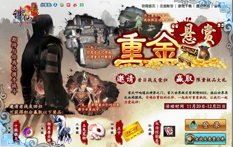 VIP新手卡礼包,20余种珍宝任你挑选 寻找老战友,邀请老玩家回归赢大礼!——进入>>《诛仙2·为爱成神》老友回归专题页,登录完美通行证,将你的专属链接发送给你的老朋友,邀请他回归《诛仙2·为爱成神》,即可获得积分赢取10级铁玉等大奖!赶快邀请你的老战友回归吧! 寻找老战友
