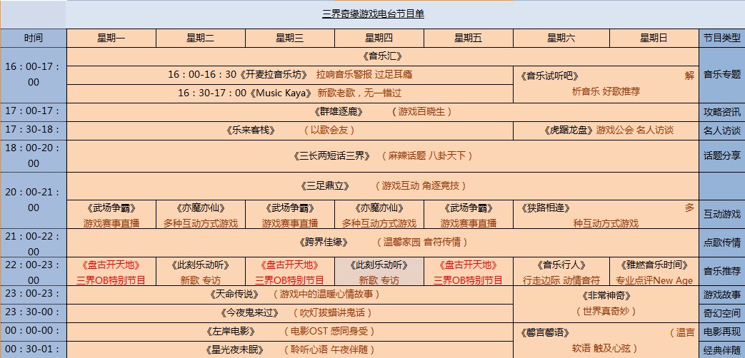 三界奇缘网络电台节目单 公测后电台将移植到游戏中 12月3日公测开启后,冰动娱乐运营团队计划将《三界奇缘》网络电台移植到游戏中,方便广大玩家使用,这一大胆的举措目的就是为了增加游戏的娱乐性、互动性,一改网络游戏给人枯燥乏味的感受。届时玩家不仅可以在官方网站入口收听电台,还可以通过游戏中左上角的“电台”按钮直接收听网络电台,即方便又简洁!