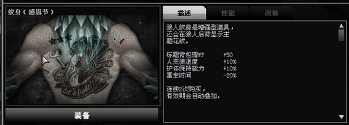 纹身向来有左青龙右白虎,前朱雀后玄武的说法,就连星爷的电影里面也有“左青龙右白虎中间一条hellokitty小内裤”的闹剧。不过,青龙白虎算什么,《狼队》的狼人们还有让你更惊叹的全新式火鸡纹身! 明天就是感恩节,除了准备好招待对手的火鸡腿炸弹,给自己弄一个火鸡纹身也是狼人们非常乐意的事情!美观加实用一直是《狼队》道具的一个重要特点,火鸡纹身除了搞怪的外表,属性也非常可观!