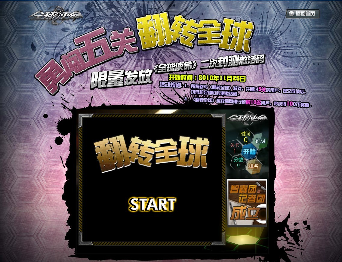 “勇过五关,翻转全球” ——玩《全球使命》小游戏得Q币及激活码奖励 “游戏就是要让你快乐”——玩是人类与生俱来的天性。从游戏中学习,从游戏中享受快乐。《全球使命》深谙“快乐”之道,隆重推出FLASH特色小游戏“翻转全球“,让更多人在闲暇时刻享受“最简单”的快乐。同时还为大家预备《全球使命》二次封测限量激活码及丰厚的Q币奖励,让大家在轻松游戏的同时还能获得意外惊喜。 |