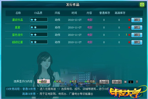 二、制作CD出售(主要赚钱方式) 可制作出售的CD包括两种: 音乐CD(需要5—10首歌才能做成1张专辑,体力消耗非常大); 影视CD(电影或者电视剧,选好导演和演员就ok了,体力消耗较小)。 制作好之后就是到“街道—商城”进行产品投放了,投放CD注意事项: 1、选择人流量高的商场,一份作品多分几份并在不同的商场投放,资金回流会比较快。 2、CD的品质影响销量,做好的产品可使用大师指点以提高作品品质(使用星钻100%提升作品品质,不使用星钻有概率提高),另艺人的达成度也影响CD品质,注意要不断培养艺人。