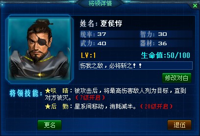 夏侯惇 属性:统率37 武力40 智力30 器材36 技能1名称:啖睛 技能1说明:被攻击后,将最高伤害敌人列为目标,直到对方被灭 类别:战斗移动状态技能 武将对白:伤我之敌,必将斩之!! 技能2名称:后勤 技能2说明:己方星系间移动,消耗减半。