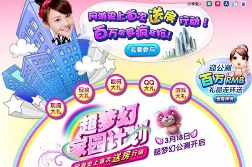 五、Q币、Q钻算神马!玩游戏就必须得房子 今年3月1日,搜狐畅游的送房广告占据众多游戏杂志封面,代言人“雷阵雨”女主角郑爽俨然成为畅游楼盘的售楼小姐。如此大胆的推广方式可谓前所未有,很多人都不敢相信真有玩游戏送房子的好事,事实上也没有这种好事。买不起房成为了这个社会永远不过时的热点,畅游利用了这点并且为自己带来了不少人气,但不千万别相信真的有房子送,其实不不过是变相的送游戏内奖励罢了。无论如何此举还是给那些为吸引用户而愁眉不展的厂商们提供带来了启发,如果他们的网游广告语上加上“来就送三室一厅”“注册就送阳光别墅”,不吸引人都难。