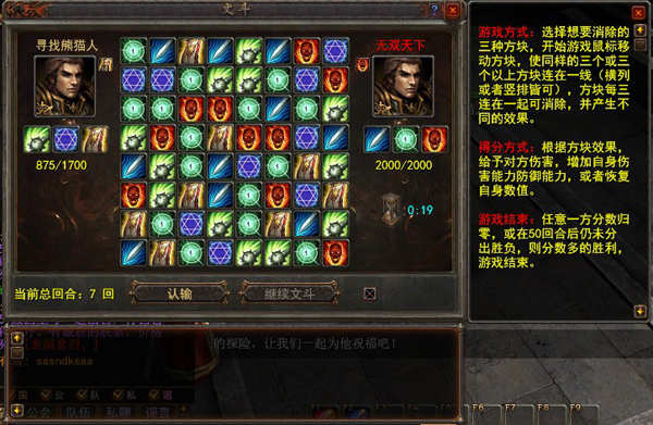 文斗,网游版连连看 魔界2文斗界面,跟连连看玩法相似 如果在硬碰硬的PK中难以取胜,那么玩家可以选择和对方文斗,魔界2文斗系统采用和连连看相似的模式,移动指定模块让三个技能标志练成一线即可对对方造成伤害,并可回血。要想取胜不仅要有眼力也要有统筹能力,搭配伤害输出和回血防御。 无PK,无魔界2。暗黑世界的生存法则只有一个,暗黑世界的生存方式只有PK。1月13日,魔界2暗黑公测,战争升级,七大类PK模式等你挑战。谁能成为生死PK最后的胜者?魔界2终极传奇,等你来开创! 更多精彩请访问《魔界2》官方网站 |
