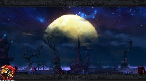 石矶洞——圆月当空,阴沉的乌云遮蔽了地面的枯木,而在枯木中穿行的恐怖怪物散发着红光!