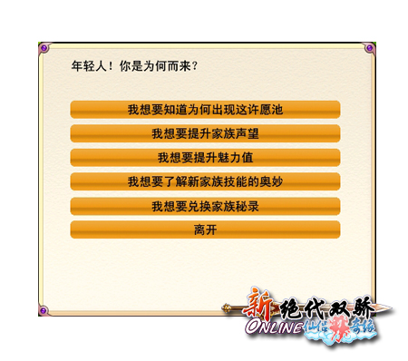 新年伊始,想为自己、朋友和家人祈福祝愿么?希望自己在《新绝OL》中有新的收获?那么千万不要错过《新绝代双骄OL》最新的资料片“仙侣奇缘”。《新绝代双骄OL》最新版资料片“仙侣奇缘”在新的一年,为你开辟了一个全新的功能——许愿池功能。只要你是家族成员,许愿池即