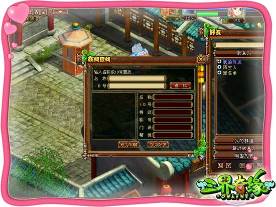 功能强大 我就是你的贴身“导航仪” 《三界奇缘》内置QQ群的创建也十分简单,且不设任何门槛,每一位玩家都可以在游戏界面自由创建。专属定制的“在线查找”功能方便玩家搜索当前在线人员情况,通过输入名称或ID即可直接搜到你要找的朋友,并添加至你的群组。“周围列表”则像贴身“导航仪”一样,精确告知你周围的NPC及玩家情况,方便你发起任务、找寻组队。有了“好友搜索器”和“导航仪”,就再也不怕迷失在荒山野岭中找不到朋友啦。还没创建《三界奇缘》内置QQ群的同学,赶快来体验一下吧!