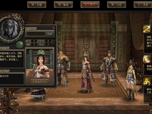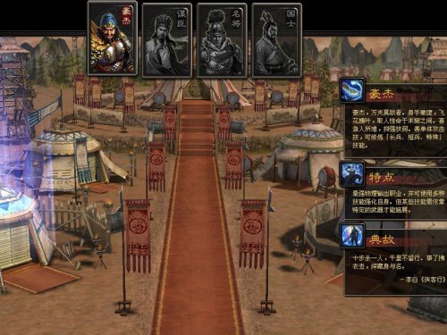 职业选择,镜头移到对应营帐,并出现介绍 豪杰系:最强物理输出职业,并可采用多种技能强化自身,相当于一般网游里的战士职业。可修炼“长兵”、“短兵”、“特殊”三系分技能。适合于爱好冲锋陷阵,追求极致物理攻击的职业。 谋臣系:最强法术输出职业,拥有最广的攻击范围。在战斗中是队伍里“炮台”一样的存在,但是对应的,谋臣的生命存活力较弱。可修炼“谋术”、“方术”、“异术”三系分技能,适合喜欢绝对攻击力的玩家。 名将系:最强辅助职业,同时拥有着最快的出手速度。在战斗中用各种己方增强技提升队友的战斗力,谓之“不战而屈人之兵”。不足之处是直接攻击力较弱,可修炼“阵法”、“战术”、“军令”三系分技能。 国士系:在队伍中充当着医生的作用,是最强治疗职业,同时还能消除己方队友的多种负面状态,是整个队伍生存的保障。牺牲了攻击力的国士换来了最强的防御力,生存力强。可修炼“工程”、“天文”、“地理”三系分技能,适合有爱心,为团体服务的玩家。 另外,游戏在创建角色界面共有5种不同的体态形象供玩家选择,分别为劲健男、魁梧男、壮硕男、柔美女和英气女。