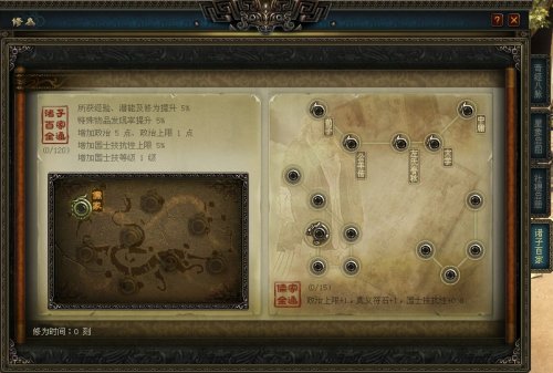 八、修为系统 游戏的另一特色即是修为系统。当20级以后,可以在长安城“马援”处接取除暴任务用来增加修为值,再用修为值点修为点。不过,某些特殊修为点需要修为书籍,修为书籍可通过除暴任务的战斗中击败太史令获得,另外完成某些任务也能够获得修为书籍。每项修为点点通后都能增加玩家的某项能力。