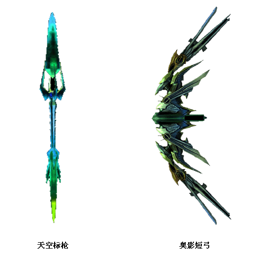 职业:弓箭手/猎人 天空标枪 带有宝石般的亮丽色泽,因带有格外多的小刀刃而具有2倍的攻击力。 猎人专用的标枪 奥影短弓 整个弓身附有银色的强力魔法。弓箭手专用的弓。