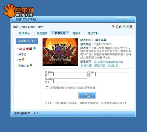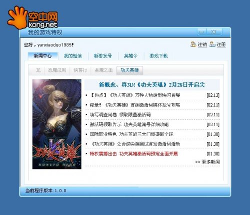 空中网今日正式推出一款实用性、针对性较强的用户特权中心,旗下倍受期待的2011年网游大作《功夫英雄》、《坦克世界》及运营中的《龙》、《圣魔之血》、《恶魔法则》、《侠客行》,更有神秘网游内部代号为00F的大作均悉数亮相空中网网游特权中心。 空中网的用户均可通过该平台免费预定旗下所有网游的测试激活码、新手礼包、道具卡、点卡、英雄令、实物周边、线下活动参与等等。该工具已通过电脑终端测试,用户可放心安装使用,但对于空中网网游特权中心这个袖珍型软件的后期开发完善工作会继续进行,并以空中网强大的手机平台开发技术实现特权中心电脑终端与手机终端的同步,打通这两个平台的资源互享将会给用户带来根本、实在的方便。 其他媒体:空中网特权中心下载地址:下载安装预定《功夫英雄》2月28日尖端测试激活码、更有神奇英雄令 地址:http://loongdown.gamall.net/UserCenter_100.exe