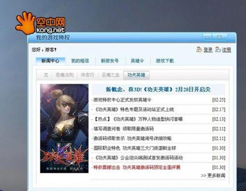 特权中心 特权感受 特权中心是空中网2011年全新推出一款实用型、针对性强的软件,空中网的用户可通过该平台免费预定旗下所有网游的测试激活码、新手礼包、道具卡、点卡、英雄令、实物周边、线下活动参与等等。该工具已通过电脑终端测试,用户可放心安装使用,但对于空中网网游特权中心这个袖珍型软件的后期开发完善工作会继续进行,并以空中网强大的手机平台开发技术实现特权中心电脑终端与手机终端的同步,打通这两个平台的资源互享将会给用户带来根本、实在的方便。 特权中心页面 《功夫英雄》这次的尖端测试版本中,游戏界面、任务、配音均不是最终版本,我们会根据玩家的意见反馈,将这款2011年的3D大作打造的更加完美,更多的创新特色与新奇玩法,让你体验到游戏带给你的无穷乐趣。