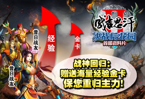《成2:决战后花园》首部资料片呼唤昔日战友 【呼唤昔日战友 重聚巅峰战场】 昔日战友邀您重出江湖,再聚首,续情缘,与兄弟们一起征服世界!为保证昔日战友迅速再现战神风采,官方特举办“昔日战友召回”活动,所有超过60天未登录服务器的游戏角色均可参与,我们为你准备了大量经验奖励和道具军备,保你重归战场主力,与莫逆好友共同挫败冥王的入侵!