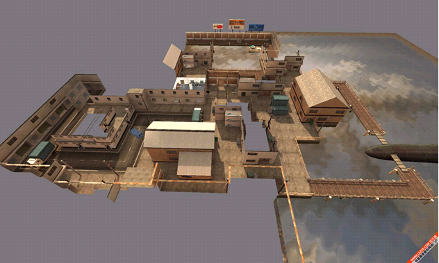 码头是一个逃脱关它的地图面积比较小,地图中的空旷地带比较多,适合狙击手作战。这张地图被建筑物分为南北两大空地,每个空地上都有一个仓库,红蓝双方出生点分别在南边空地的左右两侧,北边的码头是狙击手常用来埋伏的地方,可以监视北边的整个广场。由于位置的优势,蓝方更容易抢先占领码头进行防守,加之逃脱点就在这一区域的潜艇上,这一区域往往成为双方最终决战的关键所在。