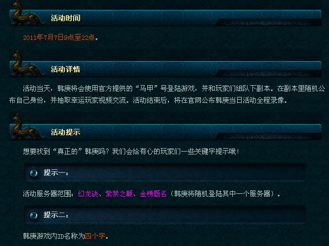 《天下贰》极爽夏日版将在近日开放,在此之前,《天下贰》代言人韩庚将为玩家带来暑期第一波惊喜,在游戏里收徒弟,和玩家一起下副本。暑期最给力的游戏活动即将登场! 【触电:零距离接触韩庚】 亚洲人气天王韩庚自从代言《天下贰》后,吸引了大批粉丝入驻,玩家们一直非常好奇韩庚是否真的会玩游戏?是否有机会在游戏里遇到韩庚?这个暑假,《天下贰》暑期活动第一波将由韩庚打响,回应玩家们的疑问。 7月7日(本周四)9点—22点,玩家只要进入《天下贰》特定服务器,就有机会遇见“伪装”成普通玩家的韩庚,拜他为师,和他一起下副本。更有幸运玩家将会和韩庚视频聊天,让韩庚满足自己的小小心愿。 暑假活动第一波,和韩庚一起刷副本 【回顾:韩庚与《天下贰》的故事】 当2010年资料片“幻龙诀”来到《天下贰》的时候,韩庚也来了。他为游戏饰演的第一个角色是终极BOSS玉玑子。随后,更是参与了多次活动。 自从代言《天下贰》后,韩庚表示,自己也会在闲暇之余玩游戏,并且在游戏里认识了不少朋友。当然,他的游戏好友们并不知道,自己这位“网友”竟然是大名鼎鼎的偶像韩庚。当被问到游戏中最有趣的事情时,韩庚表示,游戏里有一个以自己为原型的boss“玉玑子”,自己偶尔下副本需要亲手打倒这个翻版“自己”,感觉特别有意思。 韩庚代言《天下贰》