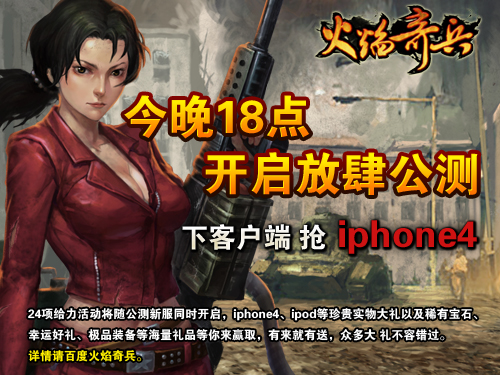 导语:《火焰奇兵》正式宣布,今晚18点开启放肆公测。特别推出18项全服活动、6项新服独享活动以及老兵回归送大礼、新玩家下载送iphone4等诸多活动。玩火焰兵保送60级,90级送金武! 《火焰奇兵》今晚18点放肆公测,届时开启三组人气新服: 电信2区:火焰奇兵/烈火雄风 网通2区:烽火连天 《火焰奇兵》游戏特色 《火焰奇兵》今晚18点放肆公测!强势开启放肆玩火、痛快解压的不眠夜!全新职业全新技能,给你视觉上和心理上双重震撼。灵活丰富的百余种玩法供玩家自由选择,与多样的游戏体验相结合,令玩家百玩不腻。从此,夏日暑气不再逼人,任何压力不再熬人,就在今晚18点,《火焰奇兵》给你带来这个夏天最解气、最放肆的游戏体验!简单、轻松、好玩、爽快,让你激情释放、痛快解压! 《火焰奇兵》职业亮点 轻松、好玩、爽快是《火焰奇兵》的亮点,轻松操作,即可体验玩火的刺激,火焰兵升级快,群攻技能让玩家顺畅度过前期,及时体验接下来的精彩装备和炫酷技能。性能完美升级的全套火焰喷射枪让玩火达到至臻境界;火焰兵的技能不体验绝对不知道有多精彩:远距离降防、减速、眩晕和近距离群晕是火焰兵的亮点,火焰兵还有遁形技能,随时脱离战斗状态是保存实力、附以更迅猛反击的前提。雄厚的活动保送火焰兵直达60级,过渡到90级,即可拿最炫、性能最爆的金色武器,一定会让玩家体验到火焰兵所带来的最轻松、劲爽的玩法。 《火焰奇兵》下客户端抽取iphone4 席卷夏日的盛大(专题 、新游 、Showgirl 、COS )活动火热来袭,注册下载抢抽iphone4、ipod touch等好礼,玩幸运转盘就给奖,给奖就给大奖,开启玩家轻松、爽快的玩火体验! 《火焰奇兵》公测新服独享活动绝顶好礼来就送 抗战《火焰奇兵》注重与玩家的交互沟通,为感谢玩家对《火焰奇兵》的关注及讨论,公测新服活动打造独享盛宴,6项给力活动助阵新服公测,连续在线拿大礼,存储经验球让新人升级快,冲刺新人王送万元礼券,部队入驻送珍贵道具,更有领取烟花送大礼、新手卡领取助新手飞速成长! 活动一:连续在线领好礼 活动时间:8月4日18:00—8月10日24:00 活动内容:每在线一小时,达到相应等级,即可以在北平教授章知博(212 ,207)处领取一次奖励,天慧卡状态、试炼徽章、属性石助新兵快速成长。 活动二:储存经验球 活动时间:8月4日18:00-8月7日24:00 活动内容: 在活动期间,到北平历史教授张明杨(205,219)处可随时领取2小时的经验储存珠状态。 以1:1的形式储存状态时间内所获得的打怪经验,储存经验球状态结束后,右键直接它释放经验值。双倍经验,助新兵“极”速狂飙。 活动三:冲刺新人王 活动时间:8月4日18:00—8月10日24:00 活动内容: 等级大比拼:截止8月10日24:00,新服等级排行榜前三名玩家,将会获得丰富礼券奖励。 财富大比拼:8月4日开服后至8月10日24:00,系统随机在某时间点查询全服玩家身上银元数额,拥有银元数额最多的玩家将获得铁血钢七连功勋录10个,兑换这些功勋录有可能获得超值奖励哦! 活动四:烟花活动 活动时间:8月8日10:00-8月8日24:00 活动内容: 10级以上所有玩家均可在北平广场李春兰(179,158)处参与该活动。使用烟花可获得经验和金钱奖励,并随机获得部队增援物资系列奖励。 活动五:部队入驻有大奖 活动时间:8月4日0:00 活动内容: 在8月4日新服开放前,《抗战》官方已发布“部队召集令”,召集精兵猛将参战,诚邀广大公会入驻新服,只要组建部队参加冲级赛,就能获得新手星火包,限时金摩托、礼券、天工开物等多重大奖。详细信息请留意官方论坛抗战司令部版块。 活动六: 新手卡领取 活动时间:当前时间-8月4日18:00 活动内容: 驰骋在《抗战》火热的战场上,新兵蛋子们如何迅速成长,主导战场的沉浮?又如何登上排行榜、赢得超值大奖?为迎接广大新兵入伍,让战士们更早地适应沙场生涯,融入部队大家庭,《抗战》官方特别推出大量新手卡,大量奖励等你来拿,助你更畅快地体验游戏精彩。领取地址为官方论坛玩家交流版块。 《火焰奇兵》全服火爆活动 《火焰奇兵》全服18项活动携海量好礼狂送玩家,BOSS巡城送海量道具,100%有货,积攒暗黑之星碎片兑换天价宝石“暗黑之星”!全民回馈活动送大量经验、银圆、礼券、珍贵道具!总裁送股票兑换实用道具!更有天降宝箱送海洋之星、黑钻、碧血石等大量珍贵宝石属性石放松!另有激情赛车以刺激竞技送大量经验和道具!老兵回归送海量经验!不可胜数的18项全服活动盛世开启,精彩不容错过!