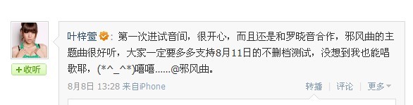2010年最美Showgirl,新一代宅男女神叶梓萱,在前往成都参加《邪风曲OL》产品发布会时,对现场演唱的同名主题曲表现出浓厚兴趣。发布会结束后,经发布会主办方的撮合,叶梓萱首次走进录音棚,并将初唱献给《邪风曲》。 叶梓萱 《邪风曲OL》的同名主题曲《邪风曲》,由网络音乐游戏第一人罗晓音倾力打造,该曲的歌词优美动人、琅琅上口,曲风悠扬婉转亦不失激昂。尽管在8月5日举行的《邪风曲OL》产品发布会上,该曲目与大家见面,并博得了一片赞扬之声,但该主题曲并未确定最终主唱。 在发布会上,当听到这首歌曲时,叶梓萱即对其产生了浓厚兴趣。叶梓萱表示,自己渴望全面的发展,但此前从未有过任何主题曲的主唱经历,这次如果有机会成为《邪风曲》的主唱,自己一定好好把握,尽最大努力演绎出最完美的《邪风曲》。 发布会结束后,在主办方的撮合下,叶梓萱首次走进罗晓音的录音间。虽然没有深厚的演唱功底,但叶梓萱认真而谦逊的态度,一遍一遍练习力求完美的决心,让在场所有的工作人员动容,也得到了罗晓音的认可。在网络游戏音乐教父罗晓音的指导下,叶梓萱完成了《邪风曲》的第一遍完整录音,试听效果十分不错。 叶梓萱第一次完成录音后发表微博