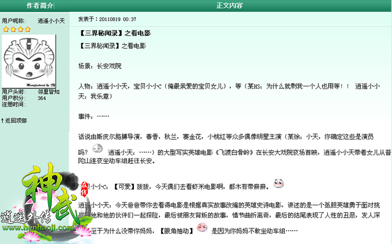 《神武》超有才玩家再创奇思妙作,强势推出“三界秘闻录”,尽显其八卦搞笑之能。玩家带女儿看电影,岂料过程中状况百出,父女俩无厘头对话雷到一大片网友,结尾更让人捧腹大笑。到底发生了什么呢?大家一起来围观吧! 近期电信新服推荐:月满西楼 新片上映 备受玩家追捧 话说由斯皮尔胳膊导演,春香、秋兰、赛金花、小桃红等一众明星大腕主演的大型英雄史书电影《飞渡白骨岭》在长安大戏院夜场首映,于是“逍遥小小天”带着女儿“宝贝小小C”从普陀山坐动车组连夜赶赴长安城。 宝贝小小C:(可爱)拔拔,今天偶们去看虾米电影啊?都木有带麻麻。 逍遥小小天:今天爸爸带你去看的电影是根据真实故事改编的英雄史诗电影,讲述的是一个勇于面对挑战的孤胆英雄和伙伴们一同探险最后却惨遭背叛的故事。故事情节曲折离奇,引人入胜,结尾表现了人性的丑恶,发人深省,至于为什么没带你妈妈,(眼角抽动)是因为你妈妈不敢坐动车组…… 【长安大戏院 酷炫舞台剧】 剧情跌宕起伏 父女无厘头对话最有爱 逍遥小小天带着女儿来到了长安剧院,未几电影开始了。 宝贝小小C:拔拔,那个大葛葛为虾米要找四个银陪他一起去哦,他也怕一格银走路吗? 逍遥小小天:(耐心的讲解)因为他要去做很危险的事情,正所谓一个好汉还要三个帮,组队去做这件事情,成功的希望是很大的,他们五个人代表着正义、诚实、勇敢、仁爱、谦卑,哎呀呀,(鸡冻)说得我都有些热血沸腾了。 这时电影刚好演到主角带着他的伙伴费尽周折斩杀魅灵,这可让小女儿心生狐疑,遂向爸爸询问。 宝贝小小C:(不解)拔拔,内些大葛葛为虾米要打大街街,麻麻说打女银的男银都不细好银! 逍遥小小天:(暗道:这是老婆在挖我的大后方啊)咳咳,宝贝记住了,男人打女人是不对的,但是如果女人做了很坏很坏的事情,男人就要让他知道错了,就像宝贝做了错事,爸爸要打屁屁一样。 宝贝小小C:(恍然大悟)原来大葛葛在打大街街的屁屁哦! 【有才玩家论坛热帖】 |