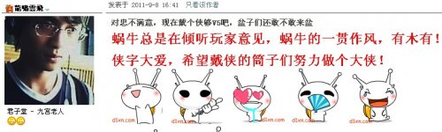 9月7日下午,《九阴真经》官方论坛发生了细微的变化。细心的玩家发现了很多论坛玩家的昵称前面增加了“忠”字,引起了论坛玩家的广泛讨论。这部分玩家之所以会有这个称呼是因为他们的论坛账号已经激活了九阴的全国区域测试。部分玩家将“忠”比喻成了古代士兵衣服上的“兵”“卒”等称呼,他们认为这个“忠”字虽然够有武侠味却缺少了一种侠客的霸气。 (论坛公告) 这项功能一推出,支持与提出建议的玩家都不在少数,蜗牛收集到了许多热心玩家的建议,在综合众多玩家的建议后,蜗牛秉承着尊重玩家意愿的态度在论坛发布了技术性讨论帖。经过长时间的讨论,赞同“侠”字的玩家占据了绝大多数。故蜗牛秉承着尊重玩家意见的理念将“忠”字改为“侠”字。 (死忠范就是这样的) (小朋友,世界很危险的) 一个论坛昵称为龍嘯雲飛的玩家就表示,蜗牛总是在倾听玩家的意见,蜗牛的一贯作风,有木有!侠字大爱,希望有“侠”字的筒子们努力做个大侠。有玩家更是表示“终于变侠了,酷!变了侠才敢出来冒泡。。前两天新注册,两天禁言!开光了”。不少玩家对于这次改变还是异常肯定的。在没有体验到酣畅淋漓的打斗快感之前先过一把“侠”瘾同样令人愉快。 (黄老邪还是有后的) 当然一项措施不可能满足所有人的想法,毕竟每个人都有不同的思想、不同的身份、不同的世界观。“侠”字出现后,就有黄老邪的后人表示自己并非正派人士,他需要邪字。而一个女玩家更是表示“侠字完全体现不出来为什么侠,忠还可以理解,干脆换成粉吧。蜗牛的粉”。这位女玩家让千千万万的男同胞如何是好。 (让男玩家情何以堪) 《九阴真经》是一款真武侠网游,而“侠”代表着奉天行道,善德仁勇,守德仗义,礼智忠信。我们都梦想着在这个武侠的世界里来谱写自己的一段江湖传说,无论你是惩恶扬善的一代大侠,还是巾帼不让须眉的女侠 ,这段武林传说即将为你展开。 2011最值得期待的真·武侠网游大作! [编辑:小苗] |