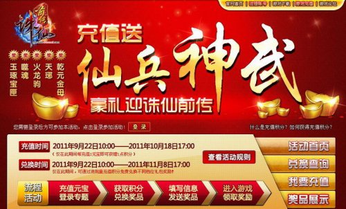 【感恩大回馈——庆《诛仙前传》公测,神器饰品充值即送!】 《诛仙前传》起源公测感恩回馈!2011年9月22日10:00 起,充值元宝免费得积分,使用积分即可换取火龙驹(珍藏版坐骑)、玉琢宝匣(宝石粉尘礼盒)等全新珍宝,还有神级饰品、乾元金母、上古神器“天琊”、上古神器“噬魂”、7级金身法身等超值好礼等你拿! 典藏坐骑、仙家法宝、超值好礼充值即送