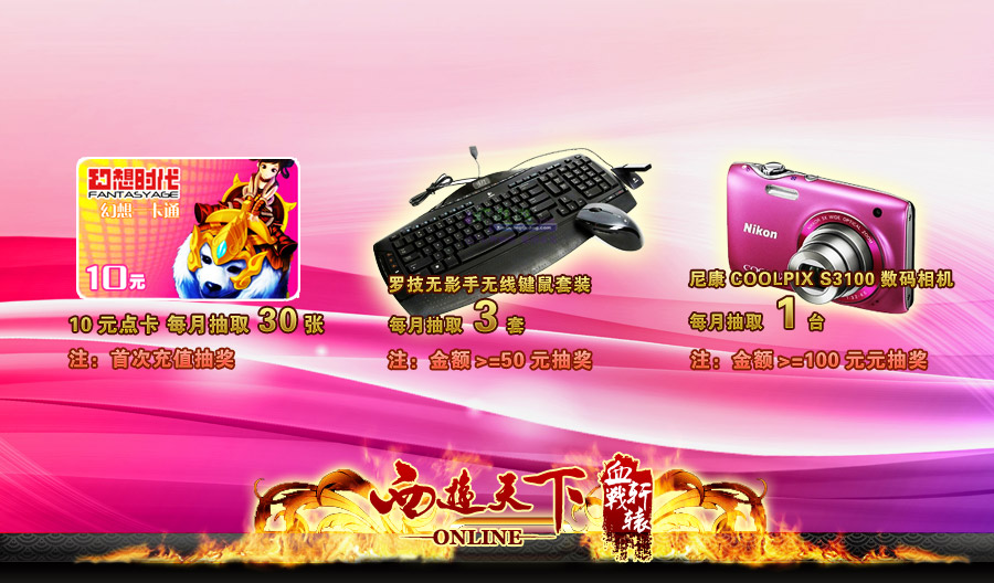 【月度抽奖 高端数码拿到手】 如果前两次的排名您都没有上榜,不用担心!《西游天下》为庆祝新年的到来,不仅只对上榜者进行奖励,还特意为玩家准备了月度抽奖活动。只要您是首次充值的玩家,我们就会抽取30名幸运玩家发放10元点卡;在充值额度大于等于50元的玩家中,我们将抽取三名幸运玩家发放罗技无线键鼠套装;当充值额度大于等于100元,抽出的玩家即可获得尼康便携数码相机!把高端的数码产品拿到手,惊喜绝对有! 《西游天下》新年倾情大回馈,缤纷礼品任你拿!只要现在加入充值队伍,即有可能获得你所爱的礼品。不如快快行动起来,为新年抢年货喽! 【关于西游天下】 《西游天下》是北京幻想时代倾心打造的一款大型西游题材3DMMORPG。游戏背景设定在《西游记》唐僧师徒求取真经之后的500年,魔王复活了当年死于孙悟空棍下的妖魔,再度掀起佛魔争锋。作为首款跨越式飞行3D网游,配合简单的操作、原汁原味的西游活动(如蟠桃盛会、神兽下凡等)、众所皆知的西游人物与其门派,使玩家置身于美轮美奂的游戏场景。 [编辑:滴答滴答] |