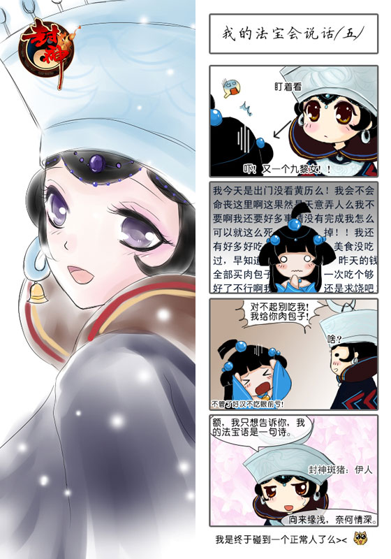 可爱的夜小灵妹妹好不容易盼到了“风花雪月”活动,逢人就问句“去堆雪人吗?”其实她就是想到处丢雪球,看到玩家变雪人……言归正传,看来夜小灵夏天含在嘴里的雪糕,不小心在冬日里融化了,却把矛头指向了无辜的蛋清妹妹。九黎妹妹果然个性十足,不可轻视! 好不容易碰上个帅哥,却发现天涯版猪正在梦游取经,竟然大逆不道的让八戒去找红烧肉吃,阿弥陀佛,太不善哉,太不善哉呀…… 法宝居然会整蛊!可怜的西昆仑哥哥居然被法宝迷惑解散了队伍,悲剧呀!好在更新后这个捣乱的法宝已经被蹲坑教育,再也不会误导玩家混乱操作了。 出门没看黄历呀,怎么到处都是九黎妹妹。看懂啊她古怪的眼神就害怕,直哆嗦呀……没想到伊人版主发神经了,告诉蛋清哲学难度系数N高的法宝语。 长篇四格漫画连载讲述了蛋清被阴森的九黎怪叔叔恐吓,吓到赤果果束手待毙。幸好御天飞行的妹妹紧急迫降,化解危机。看来与UFO亲密接触不见得是坏事哈!