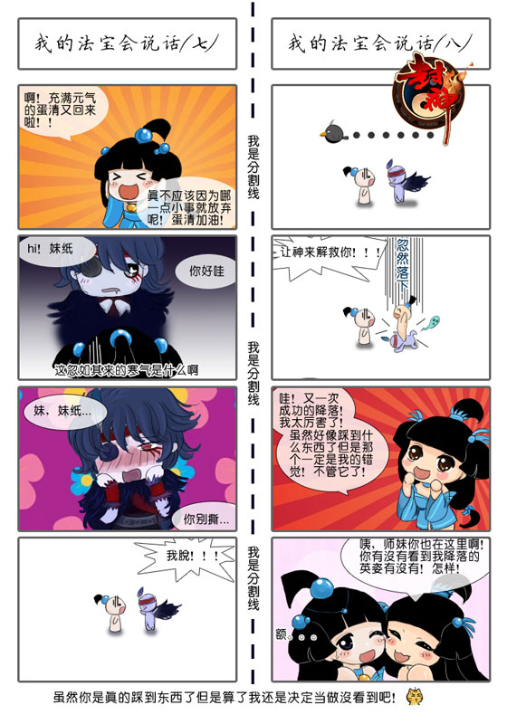 蛋清妹!你爹喊你回家吃饭!蛋清屁颠屁颠追随父亲大人,不小心掉出一张蛋清个人小档案。 年度人气回合网游《封神》火爆公测中,加入《封神》,打造你独一无二的法宝吧!还有五大社区系统、五大创新玩法、元旦活动“风花雪月”等你来体验! 关于封神: 擎天柱网络科技有限公司的开山之作《封神》,是一款以中国古代经典神话小说《封神演义》为背景的2D回合制游戏。游戏中,那墨染丹青、诗意东方的美术风格,将中国动画的艺术格调展现的淋漓尽致,演绎出一个奇幻绚丽的神话修真世界。特别值得一提的是,游戏采用擎天柱科技自主研发的“封神”2D游戏引擎及Spree解决方案,首次在2D回合制游戏中实现1920*1080全高清超大视界的震撼体验,结合其独创的移步换景的动态场景效果以及“仙侠对弈、步步为营”“框计算”智能玩法系统,更是将2d回合制游戏带入到一个全新的体验时代。 [编辑:明白夏季后] |