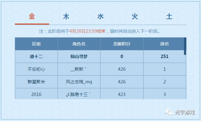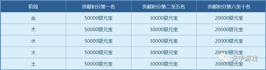 那么游戏内活跃值在这里怎么用呢?! 活动共分为两个部分,一个是根据活跃值排名另外一个则是利用活跃值抽奖。 系统将根据时间把活动划分为五个阶段,依次为“金”、“木”、“水”、“火”、“土”。每个阶段将会根据玩家在该阶段的贡献积分进行排名,各阶段贡献积分排名前十的玩家可获得银元宝奖励。