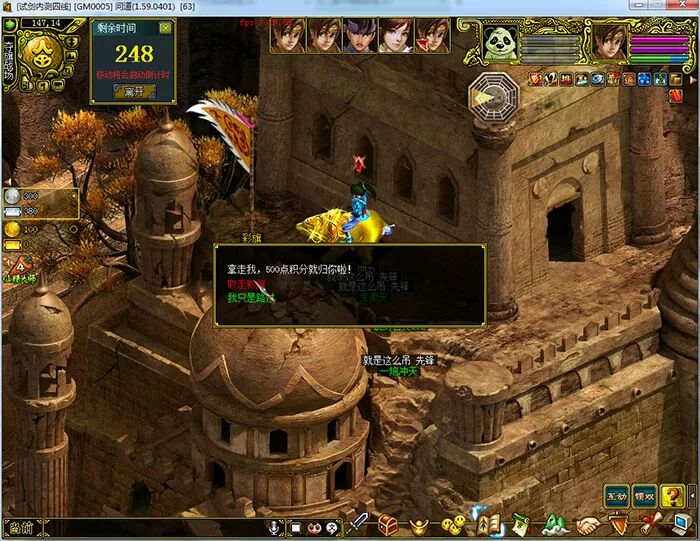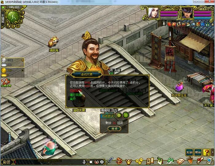 今天要向小伙伴们介绍的活动灰常有趣,道姐在测试的时候已经完全沉迷啦! 每个人只有150秒初始时间,我们的任务就是跟踪罗盘找呀找呀找,找到一只小彩旗。成功找到就可以获得战场积分、银票或金票。(使用金币入场会获得金票,使用银币入场会获得银票) PS:移动过程中有几率触发战斗或者特殊事件,完成后会获得战场积分、金票或银票并延长剩余时间。 活动奖励 2、战场积分可以兑换: 人物经验、宠物经验;人物道行、宠物武学; 3、每日积分排行前三十名可获得:大量银票。 活动时间 2018-04-25 0:00:00 至 2018-05-06 23:59:59 活动限制 2、元婴与真身共用此任务; 3、所有跨服区组不开启此活动; 4、每日只能兑换5000积分; 5、每日每个玩家有3次入场机会。 活动介绍 2、夺旗战场中存在NPC夺旗战场管理员,通过NPC随机传送到一个位置,或者离开战场,离开夺旗战场后需重新支付金币或银币方可再次入场,每日每个玩家有三次入场机会,每次入场参与活动需消耗500金币或银币; 3、地图开放时,在地图内随机非障碍点刷新一个彩旗NPC,玩家进入战场时显示黄金罗盘界面,提示信息为当前彩旗所在坐标位置。若无彩旗则不显示罗盘界面; 4、玩家根据罗盘寻找到彩旗,点击彩旗,即可领取到500积分; 5、在夺旗战场的过程中,玩家一开始会获得150秒的初始剩余时间,移动过程中的玩家有一定几率触发战斗或者特殊事件,完成后会获得战场积分、金票或银票并延长剩余时间。