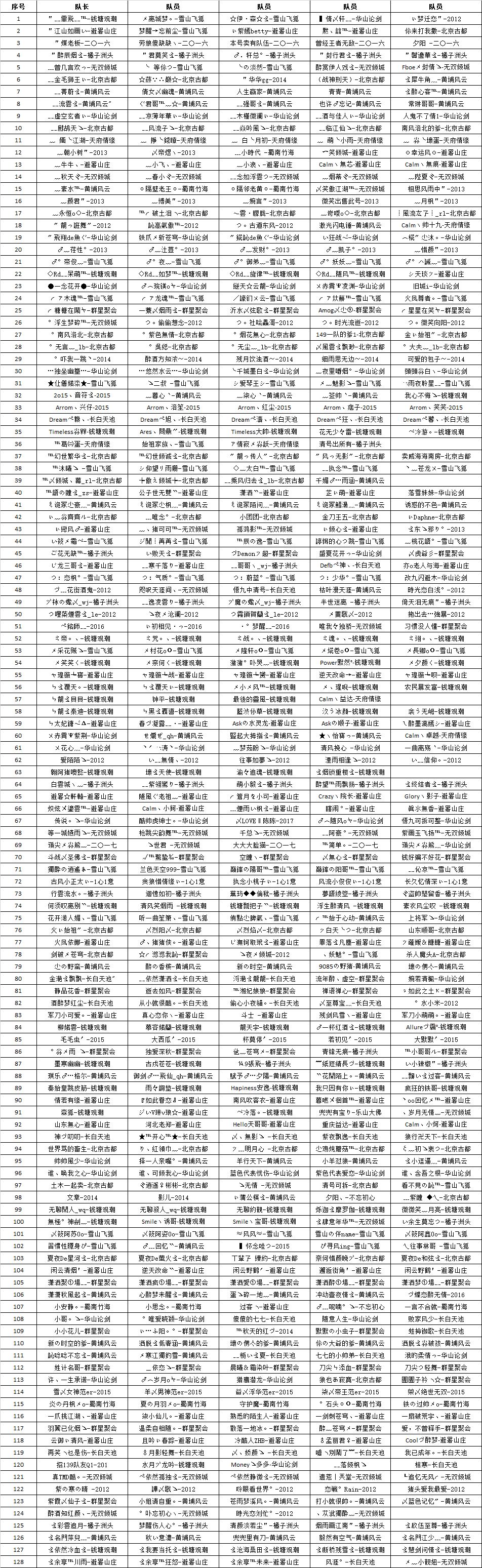 128强名人争霸赛固定队伍及其序号如下(以队长名称升序排序) (点击图片放大查看)