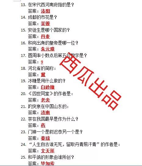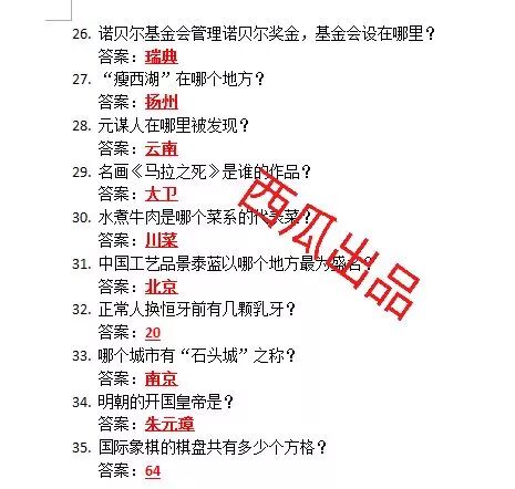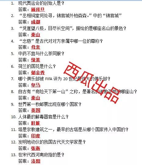 传说中的六星成就,有没有亮瞎你们的钛合金眼睛,嘿嘿,下面小编就不卖关子了,直接开始攻略课堂。 蹦撒卡拉卡~小葵花西瓜课堂开课啦~ 首先,一定有很多道友会问如何开启成就,那么小编告诉你,只要每天在线从中午开始到下午这个时间段每逢整点在世界频道回答对问题后你被选中任何一次的百科全书候选人,你的成就就算是开启啦,类似于神农尝百草成就中找到第一棵草就会触发任务一样。 其次,很多道友一定会问,那么多问题我怎么才能回答正确啊,根本来不及使用度娘。那么这也即是我写这篇攻略的意义所在,经过小编长期整理以及跟获得成就的大佬们探讨,小编总结出目前较为全面的问题列表(内附答案)!