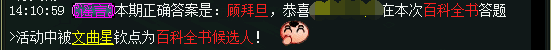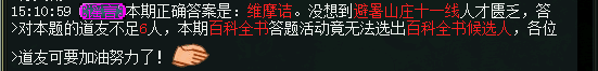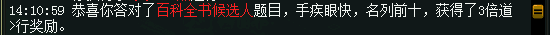 小编整理出35个问题,然后依次归纳出正确答案,如图中红色字体为正确答案。 看到这里很多道友们一定拿着攻略图迫不及待想要去完成了,那么你一定大错特错了,接下来还有比这个更重要的要说明。咳咳~拿出小板凳排队坐好了~ 从正午12点开始一直到晚六点结束,每逢整点零十分零5秒世界频道便会提示玩家做好准备回答问题,然后倒计时5秒,5秒后开始出问题,玩家有50秒的时间回答问题,也就是说当前整点十分零59秒会结束回答并公布问题答案以及谣言频道揭晓百科全书候选人,这里要说一点,有效时间内所有答对问题的小伙伴都有数值奖励,并且前10名答对问题的玩家可以获得三倍奖励。