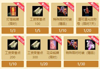 累计签到 3日 灯笼铭牌(限时) 5日 工资荣誉点100 10日 特殊限时时装(赠品) 20日 道可道光效称号(限时7天)
