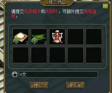 3、每个角色每日可食用30个粽子,每日可与虾兵蟹将(含龙王)获得战斗奖励10次; 4、在制作粽子的时候,如果提交一些合适的、可食用的商城道具有几率做出极品秘制粽子,如果提交其他道具会做出奇怪粽子; 5、商城道具有超过10000元宝的物品将无法提交;