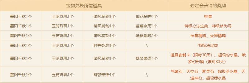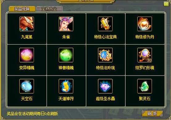 抽奖获得的道具可以到“活动大使”处选择“宝物兑换”,必定会获得对应的神兽,变异精魄,神兽精魄、修为丹、特级心法宝典等道具(注:格子内的道具每天0点刷新,刷新后会出现奖励变化但是界面中不会出现重复道具)。