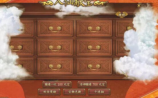 2.打开抽屉每次需要消耗200元宝,单次点击一个抽屉后,六个抽屉将全部更新进行到下一轮中; 3.玩家可以选择“偷看一次100元宝”或“全部偷看700元宝”,偷看完成后玩家可再次对其中的某个抽屉进行选择; 4.玩家可选择“双倍奖励”,点击双倍奖励后,单选一个抽屉价格升为400元宝 (注:偷看和十连抽也都是双倍元宝) ;若玩家选择“十连抽”奖励是需要10次获得,每获得一次奖励抽屉就会更新然后进行到下一轮在选择一个抽屉,以此类推 (注:十连抽过程中,如果玩家关闭该界面,则抽奖结束将不会获得之后次数奖励) ;