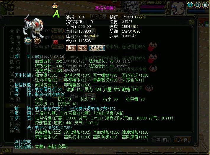 要死要活的终于飞升了,后来又努力了一下,升到134级之后,找了三本差不多的力天书,我就带着它开始征战沙场啦~ 因为是自己做的宝宝,又不想去继承(毕竟是穷人),所以武学是从零开始的,为了刷武学,它基本上便成了我唯一的任务宠物。 每天通天塔的时候,我都要格外小心星君障碍我的宠物,上来就把星君先给打死,然后再去解决宠物,可是有时候仍是避免不了被障碍。 当它被混乱的时候,一下子先把我给打死……内心可以用绝望两个字来代替,只能硬撑着打下去。缘此,带着它,通天塔也多杀不了几层。