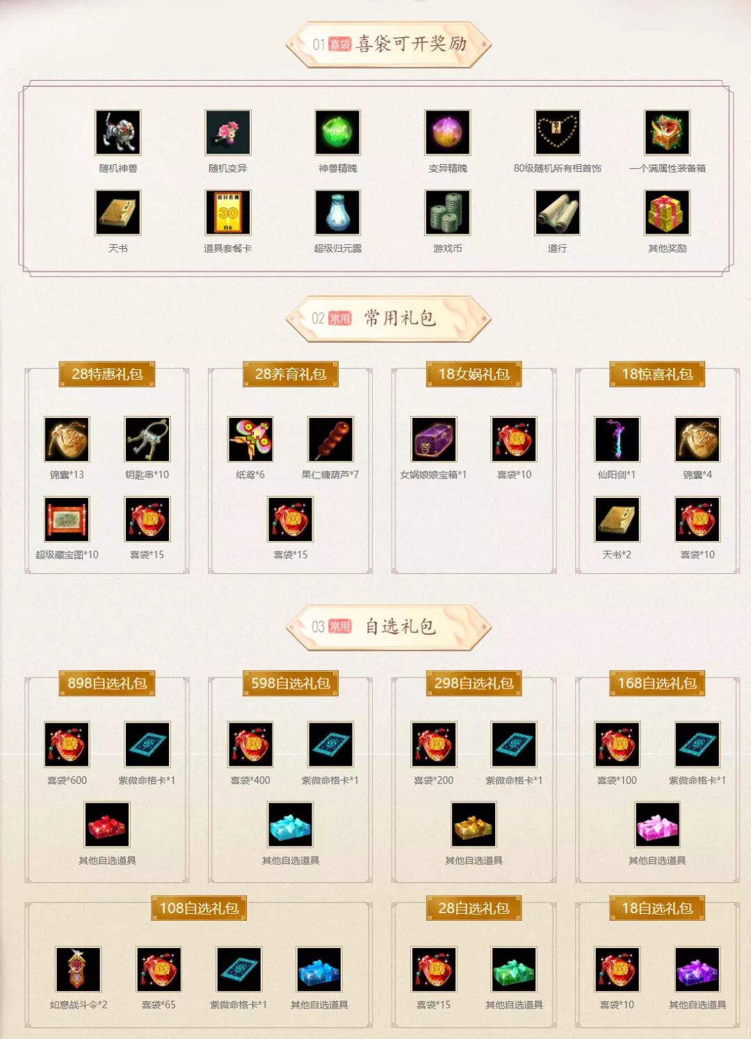 2.活动开启期间,全区组玩家在退出界面的促销系统界面上增加“自选礼包”图标,点击进入购买界面。 3.在“自选礼包”购买界面,用金元宝购买道具,购买时进行判断,将道具自动打包成符合“自选礼包类型”价值的相应礼包,免费赠予其他相应的道具。 4.购买界面分为3种类型,【练功道具】、【装备打造】、【宠物坐骑】,自选道具为同种类的且价值满足“自选礼包类型”的一种,才会赠予。 5.活动道具打包后的礼包为限时道具,限时为180天。 6.喜袋:有一定几率开出随机神兽、变异、神兽精魄、变异精魄、满属性装备箱、80级随机所有相首饰、、道具套餐卡、商城道具、道行、游戏币等,喜袋具有耐久度属性,每使用一次耐久度-1。 7.页面涉及内容为根据游戏内资料整理,仅供参考,如有变动,请以游戏内为准。