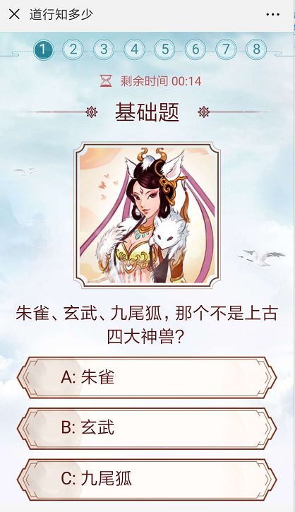 呵!终于来了一个小帅会的题 朱雀、玄武、九尾狐 那个不是上古四大神兽? 这个我答不对我还配玩问道? 根据犹豫不决就选C定理! 额!好像没有C! 那就根据两短一长选最长定理! 没毛病了!就是你了!九尾狐!