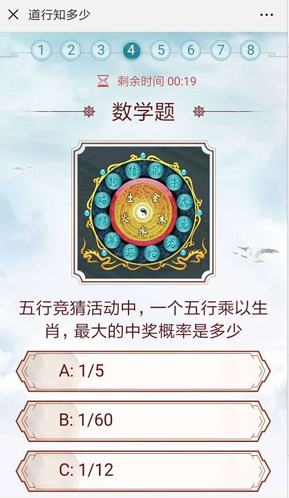 五行竞猜活动中 一个五行乘以生肖 最大的中奖概率是多少? 我的天!这都是些什么题目! 作为一名品学兼忧的问道玩家! 是不可能碰这个东西的! 不要碰五行!做个乖宝宝!噢耶!