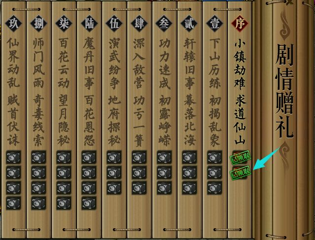 打开助力系统—>会员特权,点击剧情赠礼会展开一本古卷,当你通过了当前级别的剧情后即可领取奖励。宝箱分为10段奖励,对应1-99级10个等极段。