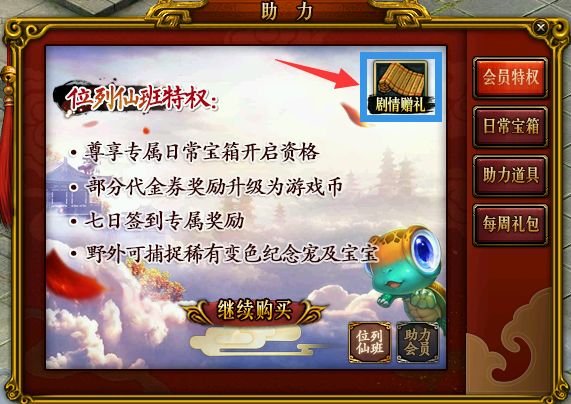 很多参与内测的道友们反馈,想领取通过剧情给的奖励,可是剧情赠礼没有找到。其实非常容易找见,道友们细心一下就可以发现,剧情赠礼在助力系统之会员特权中可见。 如图中红色箭头所示: