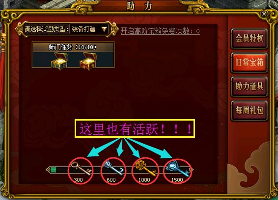 注:助力会员特权玩家可以 免费开启180次 高阶宝箱。 注意!注意!(敲黑板~)这个问题很重要! 内测中有一个很容易被大家疏忽的,通过活跃积分可获取奖励的地方,即: 在完成任务开启专属宝箱跟高阶宝箱后会给予玩家一定的活跃积分,当活跃积分达到不同阶段时就可以点击开启不同的钥匙,从而获得不同的奖励。 活跃积分有四个阶段,即:300、600、1000、1500四种,每达到一个阶段就可以点击开启当前阶段的奖励。当活跃积分达到1500且领取完奖励后,会开始新一轮的活跃积分积累。