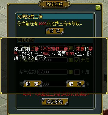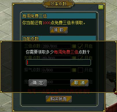 1.点击功能点数后方的“+”号,可以补充某一功能点数,补充的点数可以自己设置。 2.点击“购买所有”,可以将三倍、如意和紫气点数均补充至800点。如下所示