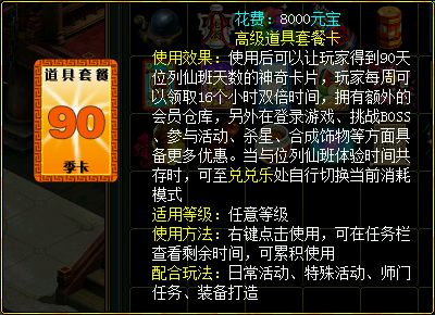 首先,先说普通位列仙班,以往位列仙班28元/月,平民玩家也可以通过工资系统获取。小资玩家亦可以直接购买80元的三个月位列仙班。 使用效果:使用后可以让玩家得到30(90)天位列仙班天数的神奇卡片,玩家可以每周可以领取16小时双倍时间,拥有额外的会员仓库,另外在登录游戏、挑战BOSS、参与活动、杀星、合成饰物等方面具备更多优惠。